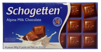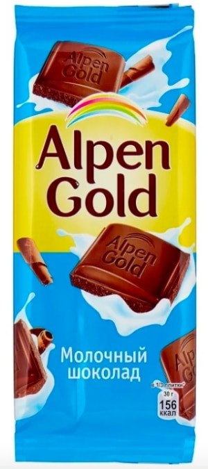 Шоколадка с добавлением альпийского молока в упаковке флоу-пак. Характеризуется нежной, однородной консистенцией и приятным молочным ароматом. Поверхность плитки имеет коричневый оттенок с легким отблеском.