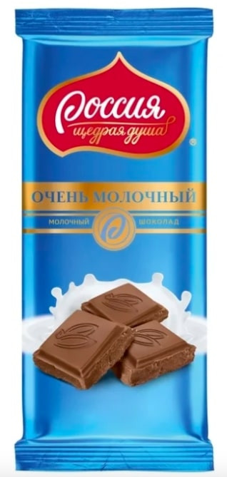 Российский шоколад со вкусом молока в мягком пакете флоу-пак. Поверхность плитки равномерного светло-коричневого оттенка, с едва заметным отблеском. Характеризуется насыщенным сладко-сливочным вкусом и ароматом.