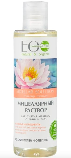 Мягкий раствор для демакияжа на 95% состоит из органических компонентов, имеет безопасный состав и не содержит красителей, отдушек и консервантов. Продукт очень эффективен в удалении водостойкой косметики, что подтверждают многочисленные отзывы покупателей. Процесс снятия макияжа макимально деликатный: достаточно нанести немного средства на ватный диск и аккуратно протереть лицо без усиленного трения. При случайном попадании на слизистую жидкость не раздражает глаза, что является еще одним весомым преимуществом при удалении стойкой косметики в области век.
