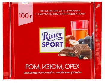 Молочный шоколад с начинкой из изюма, ореха лещины с добавлением ямайского рома. Пряный и насыщенный аромат рома чувствуется практически сразу после вскрытия упаковки. Хрустящие дробленые орехи и кисло-сладкий сушеный изюм оттеняют сливочность шоколада и придают ему яркие нотки. Рекомендуется к употреблению в сочетании с черным кофе.