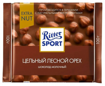 Самый любимый шоколад из линейки “Риттер Спорт”, с большим количеством начинки и без пальмового масла. Беспроигрышное сочетание нежного молочного шоколада и фундука, оторваться просто невозможно.