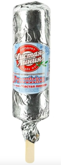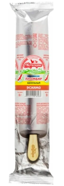 Круглое эскимо на палочке в какаосодержащей глазури в упаковке флоу-пак. Слой глазури плотный и достаточно толстый, не откалывается и не трескается. В состав продукта входит натуральный экстракт ванили, не содержит пальмового масла.