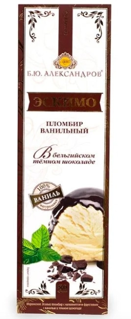 Данный бренд приобрел невероятную популярность в нашей стране и даже за ее пределами прежде всего благодаря своим творожным сыркам. Невозможно обойти стороной мороженое с глазурью из бельгийского шоколада, которому пишут хвалебные оды за невероятную вкусовую композицию. Эскимо от “Александрова” фактически является продуктом премиум-класса. Высокая цена объясняется не только именем бренда — в ход идут используемые ингредиенты: мадагаскарская стручковая ваниль, натуральный шоколад, а также стильная двойная упаковка из плотной коробочки и фольги. Вкус мороженого на порядок лучше обычного эскимо — эдакий ресторанный десерт для гурманов, который можно приобрести в обычных магазинах.